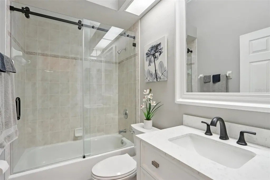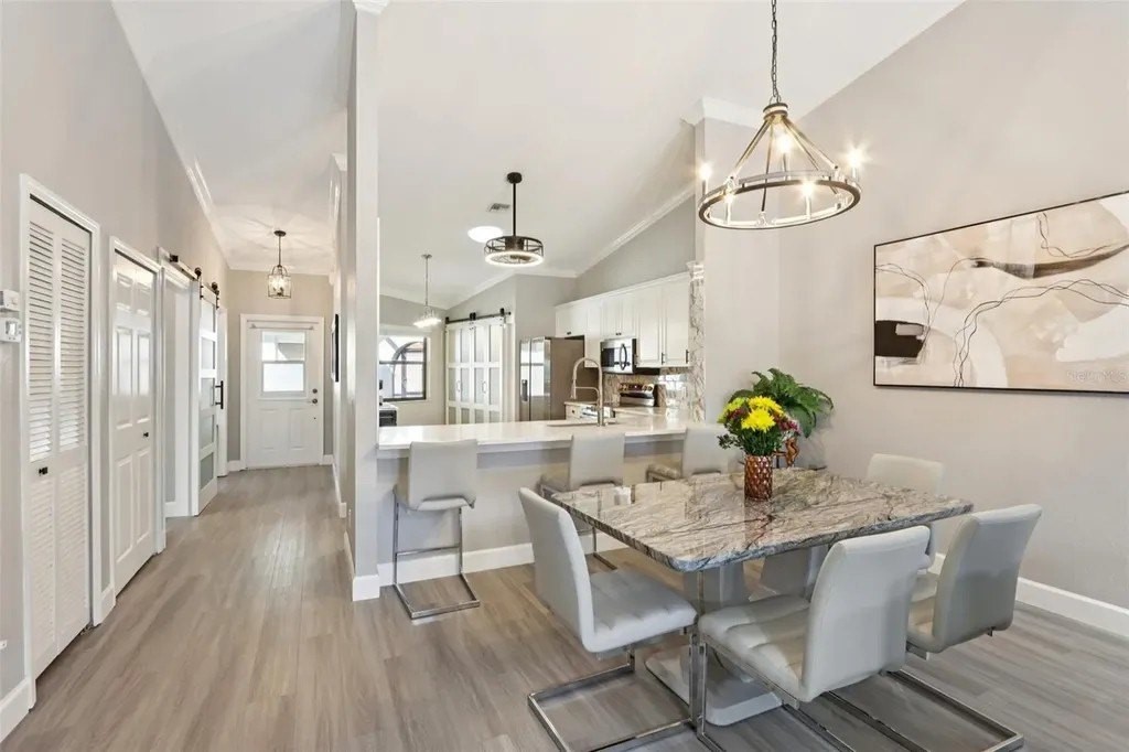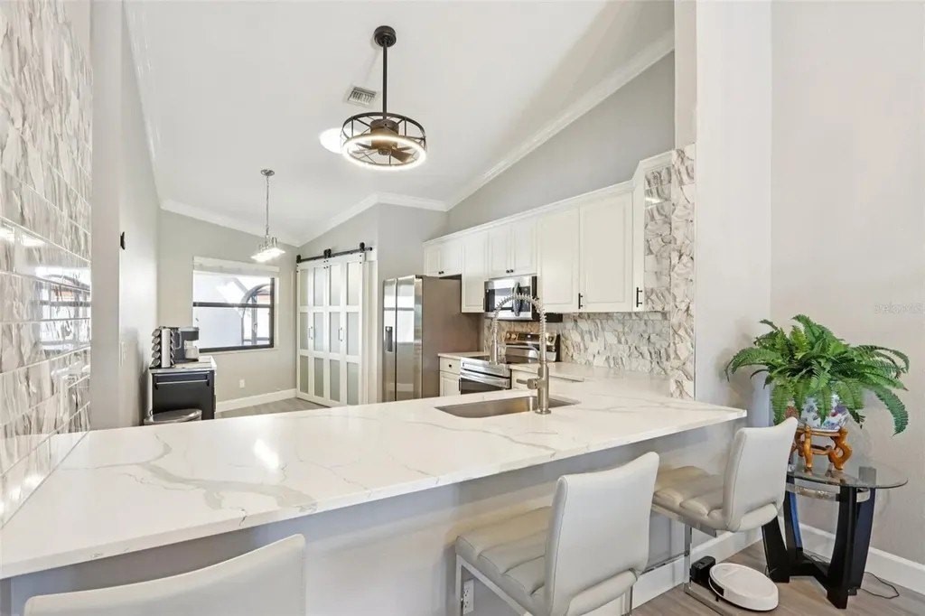 Welcome to your dream villa in the sought-after Burnt Store Isles community. This beautifully updated 3-bedroom, 2-bath home with a 2-car garage welcomes you through a charming tiled courtyard and refreshed tropical landscaping, setting a serene and inviting tone.Inside, the completely renovated interior showcases contemporary, high-end finishes throughout. Soaring ceilings, crown molding, and new lighting and ceiling fans enhance the open, airy feel, while luxury vinyl flooring flows seamlessly for modern style and easy maintenance. The expansive 25-foot great room opens through French doors to a large screened lanai-ideal for both relaxing and entertaining.The gourmet kitchen is a true showstopper, featuring brand-new appliances (including washer and dryer), custom cabinetry, granite countertops, and a stylish backsplash. A breakfast bar provides the perfect spot for morning coffee, with ample space for dining and gatherings.The primary suite offers a peaceful retreat with sliders to the private lanai and new spa. The en-suite bath features dual sinks and a modern shower, blending comfort and elegance. Two additional guest bedrooms provide flexibility for family, visitors, or use as a home office, den, fitness, or craft space.The upgraded two-car garage includes a new epoxy floor and overhead storage racks for excellent organization. Additional improvements include fresh interior and exterior paint, a two-year-old metal roof, and hurricane shutters for added peace of mind.